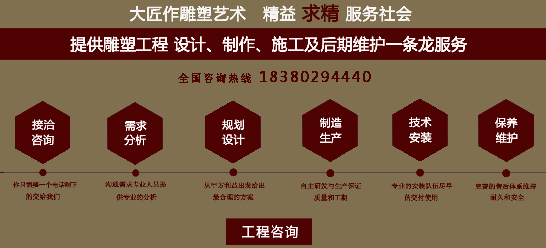 成都大匠作雕塑有限公司,是經(jīng)成都工商局審定注冊的正規(guī)專業(yè)雕塑制作及工程安裝服務(wù)機構(gòu),是由一群年輕富有朝氣的年輕人創(chuàng)辦,發(fā)軔于四川省成都市龍泉驛區(qū)。它是一家******于創(chuàng)作、制作和銷售為一體的公司。大匠作擁有多年從事公共藝術(shù)的專業(yè)人員和雕塑制作人組成的核心團隊,為您提供專業(yè)、具創(chuàng)新的設(shè)計及制作服務(wù)。公司成立以來,秉承“******服務(wù)、誠信為本”的宗旨,以客戶需求為目標(biāo)導(dǎo)向,不斷學(xué)習(xí),進取,優(yōu)化和提高服務(wù)質(zhì)量,公司向您******——“您的滿意***是我們的信譽”,我們將以飽滿的熱情和******的服務(wù)贏得您的贊譽和支持。 愛心,細心,耐心,責(zé)任心是我們的要求,盡心盡職,為您打造出創(chuàng)新、專業(yè)、******的設(shè)計方案,我們堅信先做人、后做事,用心對待客戶,實行透明收費,人性化服務(wù),本著對客戶負責(zé),對客戶負責(zé),更是對自己發(fā)展負責(zé)的態(tài)度,爭取做到讓每位客戶滿意